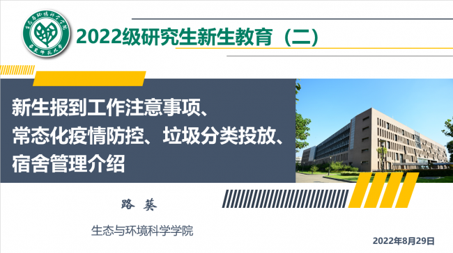 2022年8月29日晚,yl6809永利官网2022级研究生新生第二次班会在线上举行,全体2022级研究生新生参加,班会由辅导员路葵主持。本次班会是新生教育第二场专题教育活动,主要内容包括新生报到防疫要求、校园疫情常态化防控措施、垃圾分类投放要求和宿舍管理相关规定的介绍。