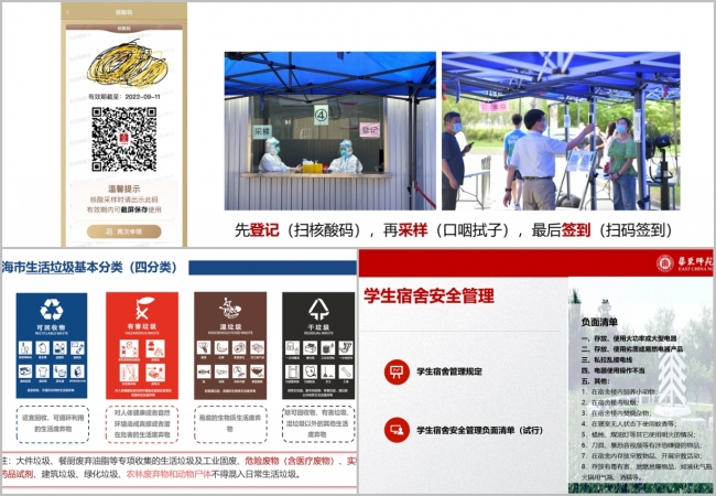 在第一部分“疫情防控无小事”中,路葵老师介绍了新生报到进校的防疫要求、报到当天的整体流程、每日健康打卡工作以及进校后常态化核酸检测的流程和要求等,帮助新生树立严格遵守疫情防控措施的责任感和自觉性。