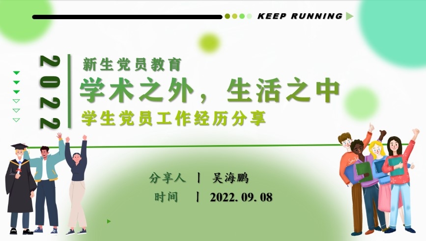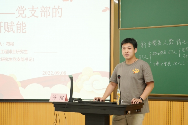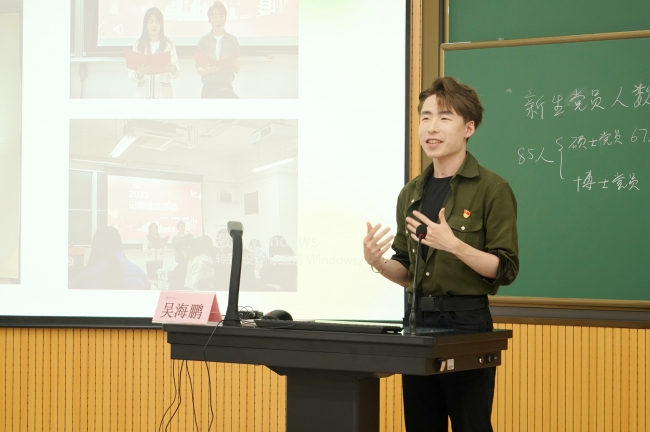 在新生党员教育活动第二部分,21级博士生党员符裕以“并驾齐驱——党支部的科研赋能”为主题分享了自己担任19级研究生党支部书记时的经验与体会。符裕谈到了自己对于党支部功能发挥的理解,介绍了自己平衡科研生活与支部生活的经验,他认为科研生活与支部生活二者并不冲突,而是可以相互赋能的关系。最后他介绍了党支部以往组织的实地探访型、学习分享型、观影感悟型活动,并希望大家能够积极融入支部生活,做到专红并举。21级硕士生党员吴海鹏以“学术之外,生活之中——学生党员工作经历分享”为主题分享了自己作为一名党员在支部的收获与成长。他详细分享了自己在支部工作、学生工作和志愿工作方面的经历,讲述了自己第一次在党支部举办活动担任行走党课讲解员、面试人才学院、参加生环小课堂志愿工作等心路历程,鼓励大家要抓住可以锻炼自己的机会,只要付诸行动一定能够有所收获。