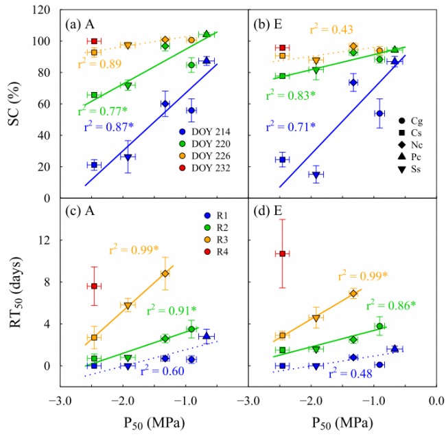 树种抗栓塞能力(P50)对光合作用(a、c)和蒸腾作用(b、d)的抵抗力(a、b)与恢复力(c、d)的影响。