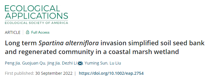yl6809永利官网李德志教授科研团队,在崇明东滩研究了互花米草种群入侵对滨海盐沼湿地土壤种子库和更新群落的影响,近期取得阶段性成果。相关研究成果Long term Spartina alterniflora invasion simplified soil seed bank and regenerated community in a coastal marsh wetland于2022年9月30日发表在美国生态学会期刊Ecological Applications上。