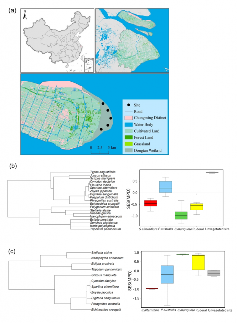 该研究结果表明,在互花米草种群入侵的东滩盐沼湿地生境内,土壤种子库内的物种多样性低,且互花米草种子所占比例大、土壤种子库内的物种组成与地上植被结构相似度高,同时,土壤种子库内的物种谱系发育结构呈聚集状态,这表明互花米草种群通过降低种子库内的物种多样性和提高物种间的亲缘关系,促进其在入侵群落内的稳定更新和成功自然化。该论文除了研究互花米草入侵群落外,还同时对比研究了海三棱藨草群落、芦苇群落、杂草群落、无植被生境内的土壤种子库。研究表明,不同植被类型下,土壤种子库内的物种多样性均高于其地上植被,说明该区湿地群落在退化过程中,土壤种子库较地上植被具有更高的物种丰富度,是各群落更新的潜在动力之源,未被互花米草种群入侵生境的土壤种子库可用做退化湿地植被恢复的有效种源。此外,该研究还发现地上植被类型和土壤微生物生物量对维持土壤种子库内的物种多样性和湿地群落恢复与重建至关重要。