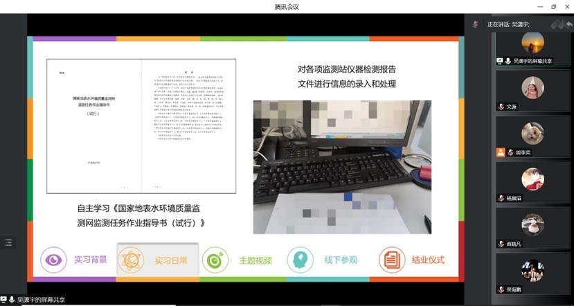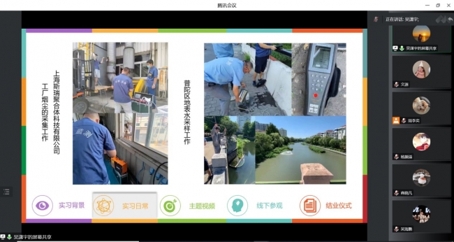 接下来是吴潇宇同学分享自己在普陀区环境监测站暑期实践锻炼的经历。这是学校团委组织的暑期实践活动,涉及到上海市的16个区和外省区县的各个街道单位。每年临近寒暑假,学校的“师大青年网”都会发布各种类型的实习实践岗位,吴潇宇同学建议大家多关注学校的官方网站。随后,他分享了实习的主要工作,一是在环境监测站自学监测任务作业指导书,二是处理检测站内的仪器检测报告,三是随同工作人员前往现场采样。详尽的讲解让我们对单位的工作内容有了更深刻的印象和身临其境的体验。