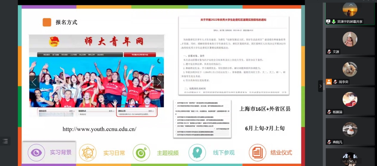 随后,李奕同学分享了在第五届进博会做翻译处小叶子的志愿者经历,从进博会举办的意义到隔离、培训、工作的内容,再带大家快速地云逛展了一下。进博会展出了许多先进新奇的产品,在疫情大背景下是提供文化、贸易、经济交流的有效平台。比起往届,今年团市委为华师大提供的岗位更加中心,能直接接触展商和参展人员,这得益于前几届小叶子们认真负责的表现。同学们纷纷对有趣的展品和薅来的羊毛表示羡慕。最后,李奕同学从参与的初心、实践出真知、观察世界的窗口三部分分享了自己参与各项活动的原因。