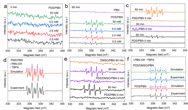 图2. 不同PDS浓度下PDS/PBN体系的初始EPR信号(a)和60 min时的信号(b)。(c)在相同反应条件下PDS/PBN、H2O2/PBN、PMS/PBN体系产生的信号以及(d)PMS/PBN体系的模拟信号。(e)PDS/PBN体系的淬灭实验以及(f)相应信号的模拟。