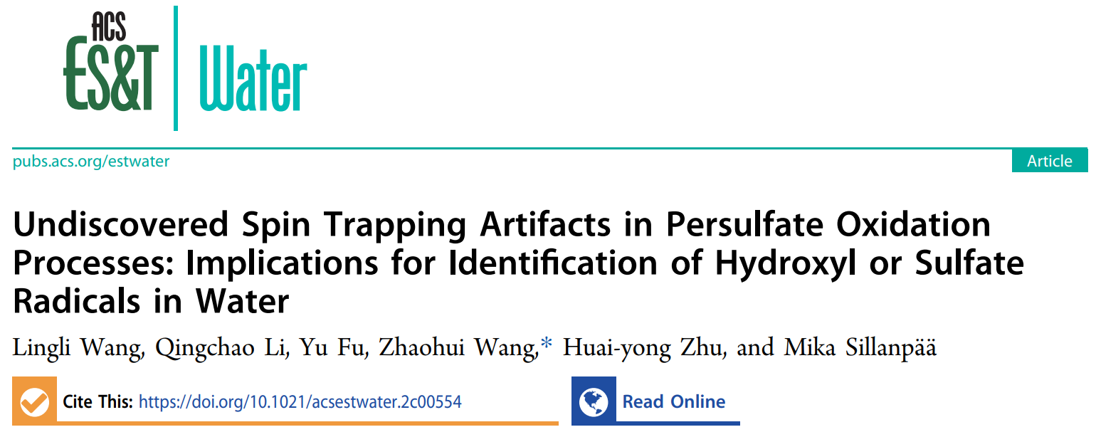 近日,yl6809永利官网王兆慧研究员团队在环境期刊ACS ES&T Water在线发表了题为“Undiscovered spin trapping artifacts in persulfate oxidation processes: implications for identification of hydroxyl or sulfate radicals in water”(DOI: https://doi.org/10.1021/acsestwater.2c00554)的研究论文。该研究工作首次报道了过硫酸盐(PDS)与自由基捕获剂5,5-二甲基-1-吡咯啉-N-氧化物(DMPO)或N-叔丁基-α-苯基硝酮(PBN)可能产生EPR伪信号的反应路径。这一发现表明,在探究催化氧化过程反应机理时选择合适的自旋捕获剂和严格控制对比实验的必要性。