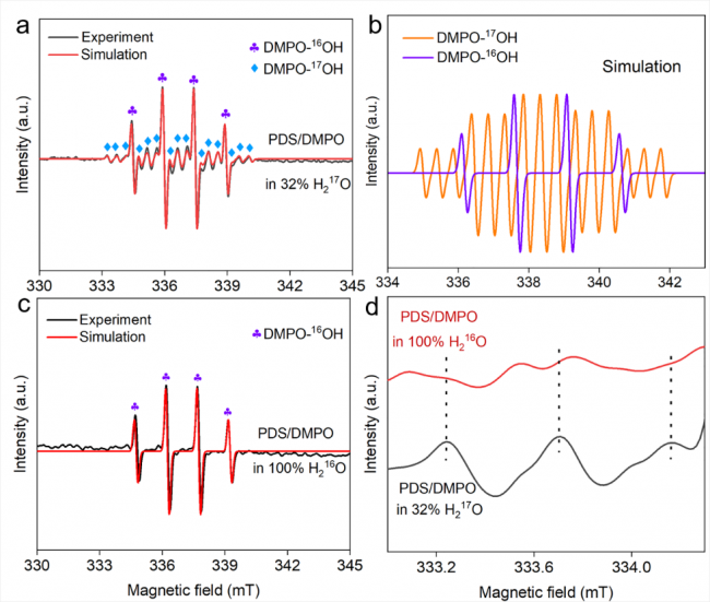 图1a展示了在H217O(32%)存在下,PDS/DMPO体系的谱图显示了17O的超精细分裂。通过模拟,我们确认了1:2:2:1的四重信号只归属于DMPO-16OH,并且可以清晰地区分DMPO-16OH和DMPO-17OH的EPR谱图(图1b)。而在无17O的水中,无法检测到DMPO-17OH信号(图1c)。在低场区,DMPO-17OH信号可以与DMPO-16OH信号区分开(图1d)。通过计算机模拟,DMPO-17OH的相对贡献估计为33%,接近于最大理论值32%(假设H2O的亲核加成是形成DMPO-OH的唯一途径)(αN = 1.49 mT,αβH = 1.49 mT,αβO(17O) = 0.46 mT))。这一结果明确地证实了DMPO-OH中羟基氧的来源,来自水而不是PDS或溶解氧。