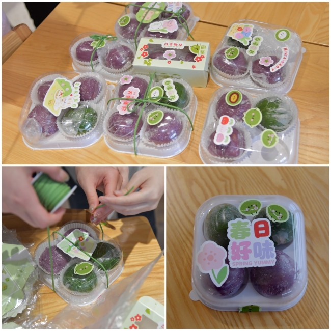 食堂师傅为大家详细讲解做青团的步骤,包括面团的揉搓方法、青团的包制手法和蒸制方式等,食堂还贴心准备了甜口的豆沙馅料、咸口的荠菜鲜肉和马兰头香干三种馅料,面团也分别用小麦汁、紫薯调制成的绿色和紫色,好看的同时也让人食欲大开。参加活动的师生大多是第一次制作青团,动作不太娴熟,但大家都很享受制作过程。在食堂师傅的指导下,大家分工合作,搓、揉、压、团……各种动作齐上阵,不一会儿,一个个软糯Q弹的青团就完成了。上笼蒸制后再经过精心包裹,变成了一个个圆嘟嘟、亮油油的青团。