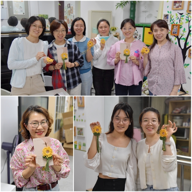 活动伊始,路葵老师讲解了手工编绳的步骤和技巧后,老师和同学们就迫不及待的开始制作,普普通通的两根绳子在大家的手指间上下翻舞,俨然是一个个认真专注的“手工匠人”。随着时间的推移,可爱的花瓣出现了、灵动的小叶子也“冒”了出来,“一朵朵”灿烂的向日葵就这样在指尖“绽放”开来。