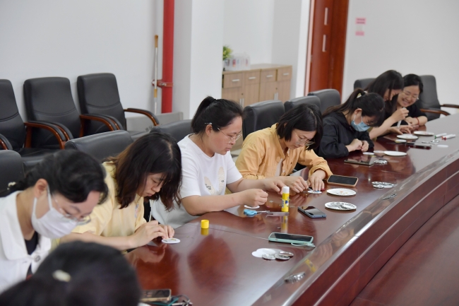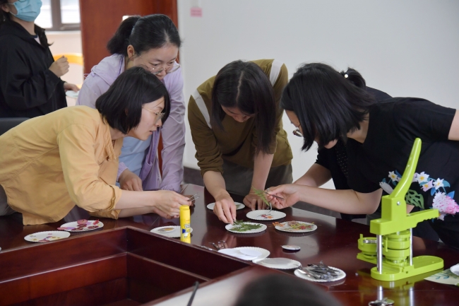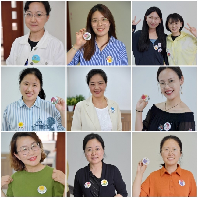 在制作过程中,大家互帮互助,交流创意和想法,收获了快乐,也是忙碌工作之余的身心放松。大家拿着亲手完成的干花徽章相互传看和欣赏,现场充满了欢乐的气息。有位参加活动的老师说“沉浸在美的创作中是件很治愈的事,每件作品都是独一无二的美”。