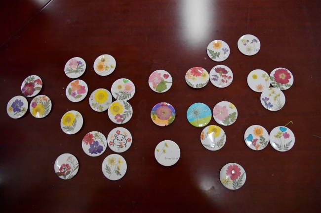 在路葵老师为大家讲解和演示干花徽章的制作过程后,大家就迫不及待开始了自己的“创作”。用镊子轻轻夹起小小的干花和叶子,在直径5.8cm的圆形纸片上搭配摆出自己喜欢的图案,附上一层透明的薄膜,再将它小心翼翼转入徽章机上,定好位,精准用力按下压膜把手,“大力出奇迹”,再放开把手时,一个漂亮可爱的徽章就诞生了。