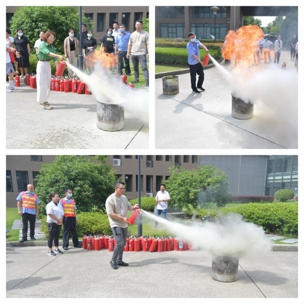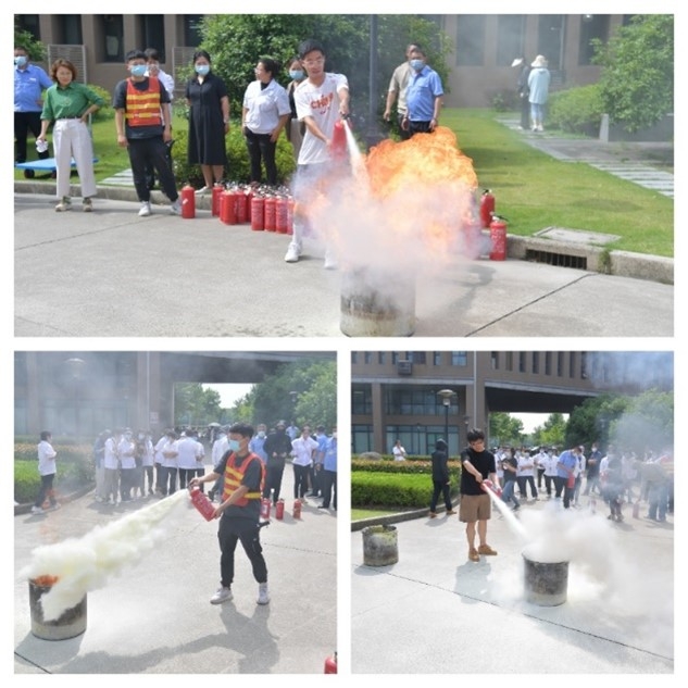 接下来,大家来到资环楼外安全空地,学习灭火器的操作,一提、二拔、三对准、四压,环环相扣。在使用灭火器时,人要与火源保持适当的距离,太远喷不到,太近又会被火烤到。同时要注意站在上风向的位置,否则很可能会引火上身。在保卫处老师的指导下,学院师生和后勤工作人员亲自上阵,练习使用灭火器扑灭火源。