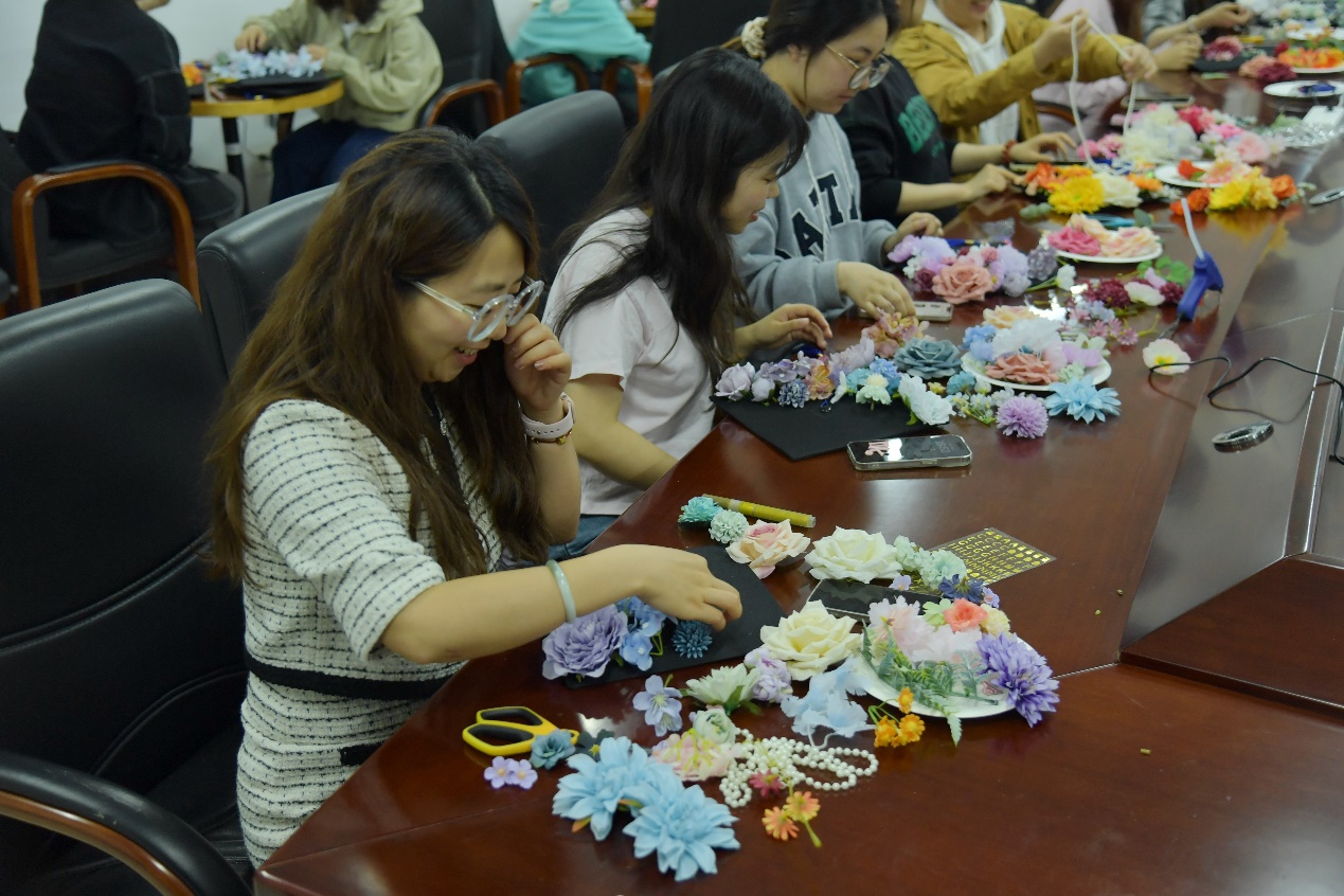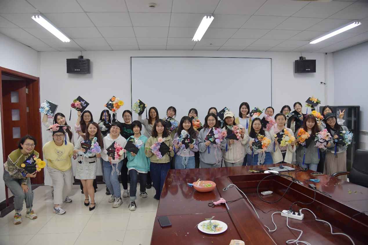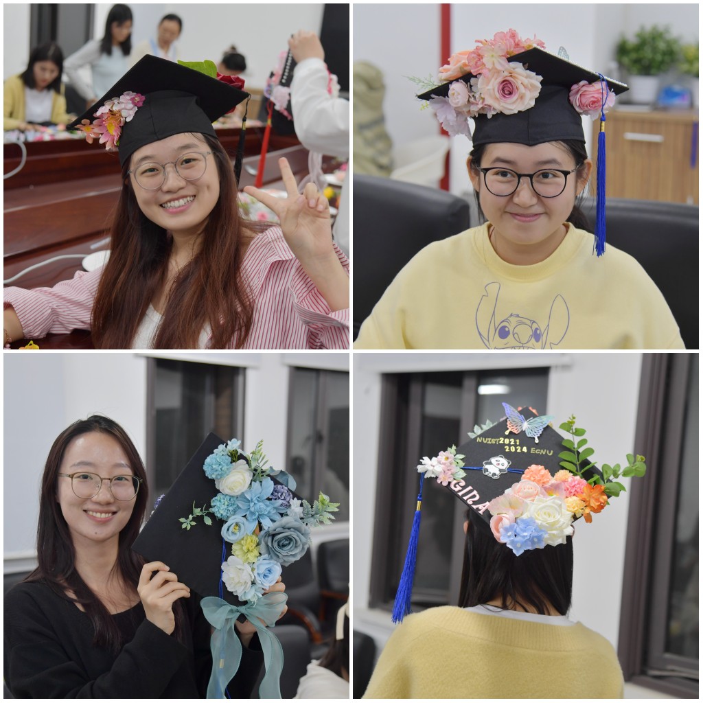 同学们头戴自己设计制作的学位帽,教室里充满欢声笑语。一位参加活动的学生说“很开心参加活动,帽顶的繁花寓意着似锦的前程,是一份独特的毕业纪念和礼物。”