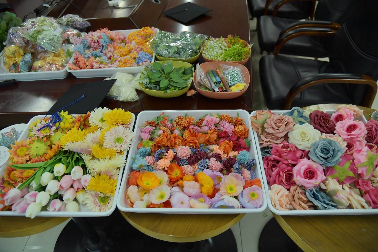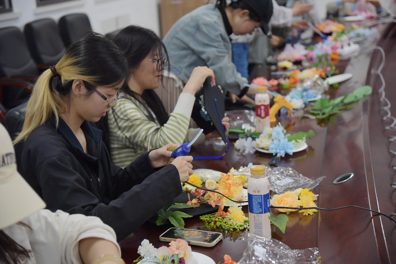 同学们手执热熔枪,以帽为“纸”,以花为“笔”,拼贴珍贵的回忆和美好的期待,描绘青春的色彩和绚丽的蓝图。两个小时后,原本朴素的学士帽被点缀得五彩斑斓,一顶顶独一无二、“帽”美如花的学位帽展现在大家面前。