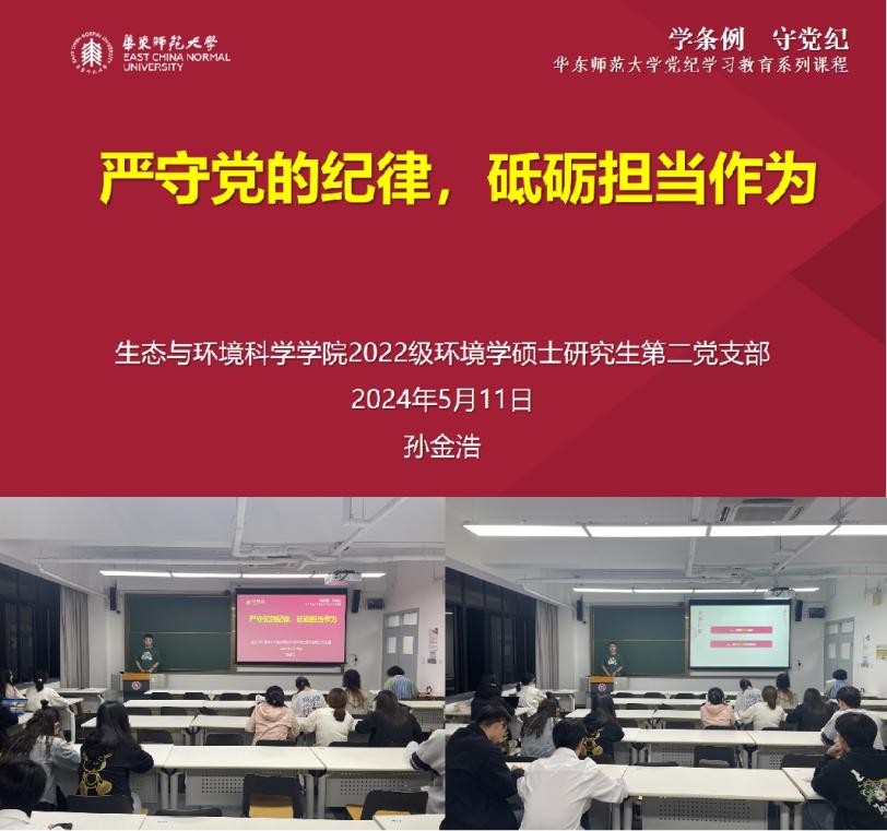 为深入学习习近平总书记关于党纪学习教育的重要讲话和重要指示精神、党中央新修订的《中国共产党纪律处分条例》等内容,2024年5月11日晚,yl6809永利官网2022级环境学硕士研究生第二党支部在闵行四教203开展党纪学习教育主题党日。活动由支部书记孙金浩主持,以“严守党的纪律,砥砺担当作为”为主题进行讲解和交流,支部全体党员参加学习。本次主题党日旨在引导支部党员牢固树立责任意识、底线意识、纪律意识,提升全体成员的政治觉悟和责任担当。