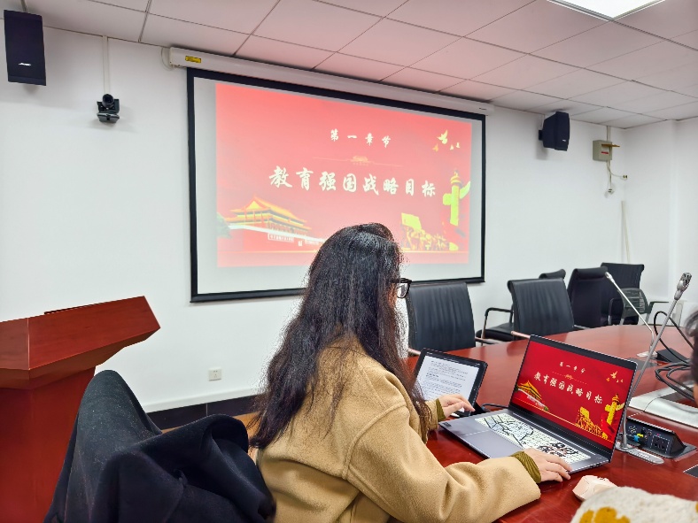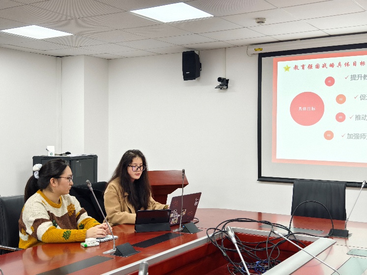 活动伊始,曹甜利同学深刻阐述了教育对于国家发展和民族复兴的基石作用,明确了建成教育强国的战略目标。然后,她深入讨论了立德树人的根本任务,让大家认识到这是深化课程改革、提升国家竞争力的关键。接着,她介绍了科教兴国、人才强国和创新驱动发展三大战略的有机结合,强调了提升教育质量、促进教育公平、推动教育创新和加强师资建设的重要性。此外,她还指出坚持思想铸魂育人的必要性,要强化师德师风建设、推进思政课程建设和优化家庭教育,共同促进家校社会协同育人。