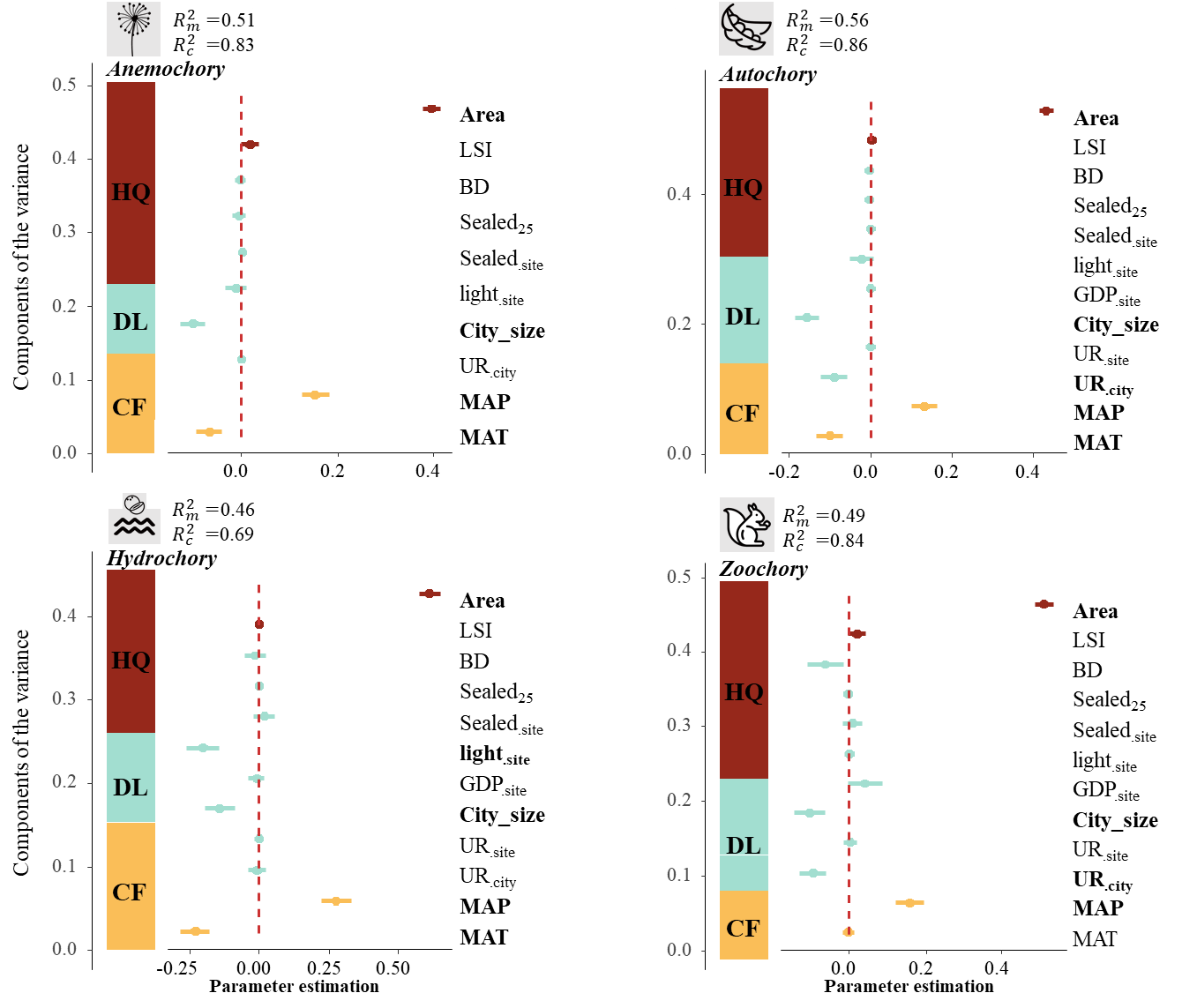Figure 5 Parameter estimates and variance explained in the averaged model for each seed dispersal mode.