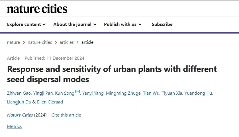 yl6809永利官网达良俊与宋坤研究团队,在Nature Cities上发表了题为“Response and sensitivity of urban plants with different seed dispersal modes”的研究论文,揭示了不同种子传播方式的自生植物的物种丰富度的影响因素及其敏感性差异,为阐明城市植物多样性维持机制提供了新的理解。华东师范大学宋坤(副教授)为论文的通讯作者,华东师范大学高志文(博士后)为论文的第一作者,中科院东北地理与农业生态研究所研究员潘应骥为论文第共同一作,合作作者单位包括:西安建筑科技大学、东北林业大学、昆明学院、新西兰Nelson Marlborough Institute of Technology。