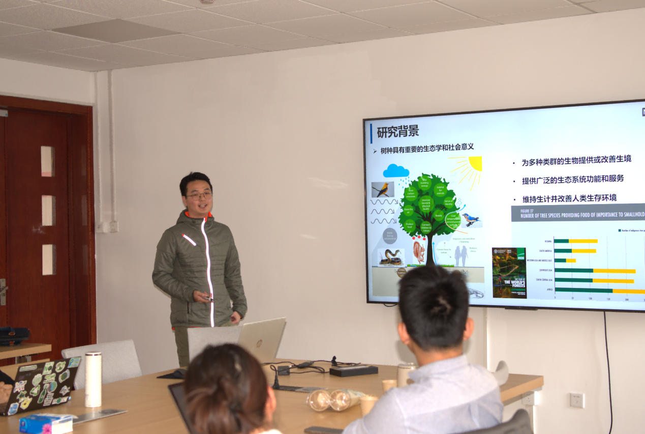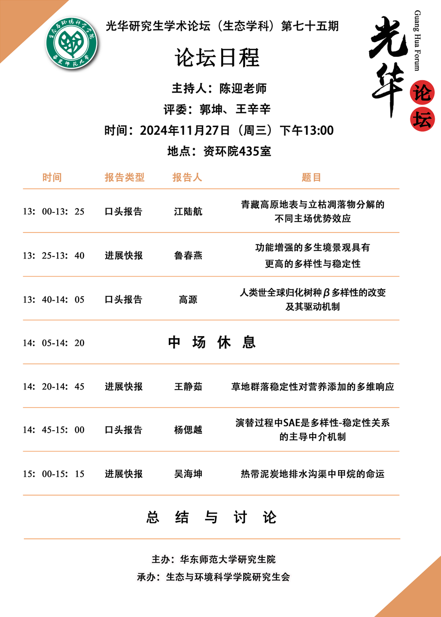 上半场的第一位汇报人是来自刘慧颖老师课题组的江陆航同学,他口头报告的题目是《青藏高原地表与立枯凋落物分解的不同主场效应》,其研究发现湿地生态系统下地表凋落物比立枯凋落物更快分解,立枯凋落物也可能存在主场优势效应,凋落物质量在维持原生生态系统中植物和分解者之间的关系中起着至关重要的作用。第二位汇报人鲁春燕同学进展快报的题目是《多栖息地景观具有更高的多样性和稳定性,并且功能更加优化》,该研究表明:多栖息地景观在物种多样性与交互均匀度、群落结构稳定性和昆虫授粉功能等方面有着重要意义。第三位汇报人是来自郭文永老师课题组的高源同学,他进展快报的题目是《人类世全球归化树种β多样性的改变及其驱动机制》,他的研究发现不同区域归化树种物种的组成和进化历史越来越相似,而且在人类世,影响归化树种分布格局因子的贡献率发生了改变。