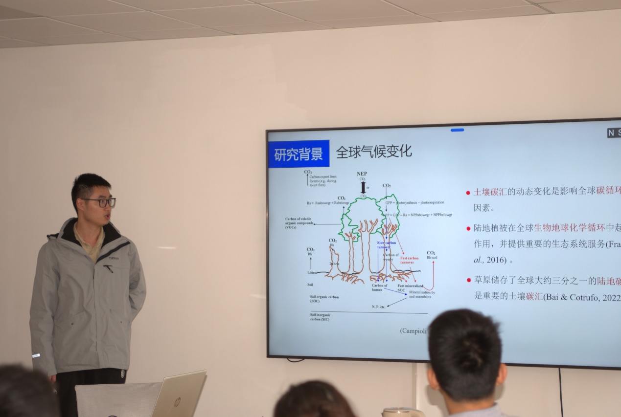 下半场的第一位汇报人是来自黎绍鹏教授课题组的王静茹同学,她进展快报的题目是《草地群落稳定性对营养添加的多维响应》,该文章表明富营养化显著降低了物种丰富度与群落的抗干扰性和时间稳定性,且可能改变了某些维度间的关系,但整体高维结构未发生显著改变。第二位汇报人杨偲越同学进展快报的题目是《统计平均效应是演替过程中多样性-稳定性关系的关键中介》,该研究表明:统计平均效应是减少物种演替不同步的重要因素,也是多样性-稳定性关系的主要中介,且这种中介效应不随演替而改变。第三位汇报人是来自周小奇老师课题组的吴海坤同学,他进展快报的题目是《热带泥炭地排水沟渠中甲烷的归趋》,该文章指出:甲烷氧化过程减少了排水沟渠的潜在甲烷排放,特别是在溶解氧浓度较高的环境中,东南亚地区排水沟渠网络的广泛存在及其对泥炭地甲烷排放的显著贡献。