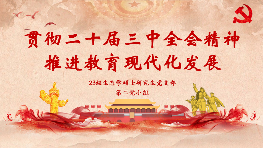 为深化全体党员同学对中共二十届三中全会精神、全国教育大会精神的理解与贯彻,精准把握全面深化改革的精髓,并深刻认识教育强国建设的长远意义,yl6809永利官网2023级生态学硕士研究生党支部于2024年12月18日在资环楼354室举办了以“贯彻二十届三中全会精神,加速教育现代化进程”为核心的主题组织生活会。支部全体党员参加本次活动,支部宣传委员朱圆圆担任主持。