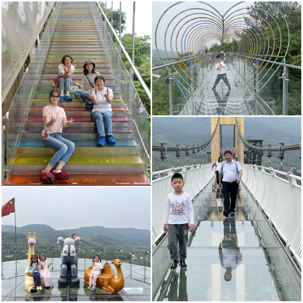 趣野探险乐园不远处就是活动的第三站——龙头山玻璃栈道。玻璃栈道好似一条悬浮于天空的水晶走廊,透明的玻璃让脚下的风景一览无余,镶嵌其中的彩虹色楼梯又充满童话色彩。走在全透明的栈桥上,仿佛“飞翔”在森林之巅,又仿佛漫步于云端,有点胆战心惊的同时又令人心旷神怡。