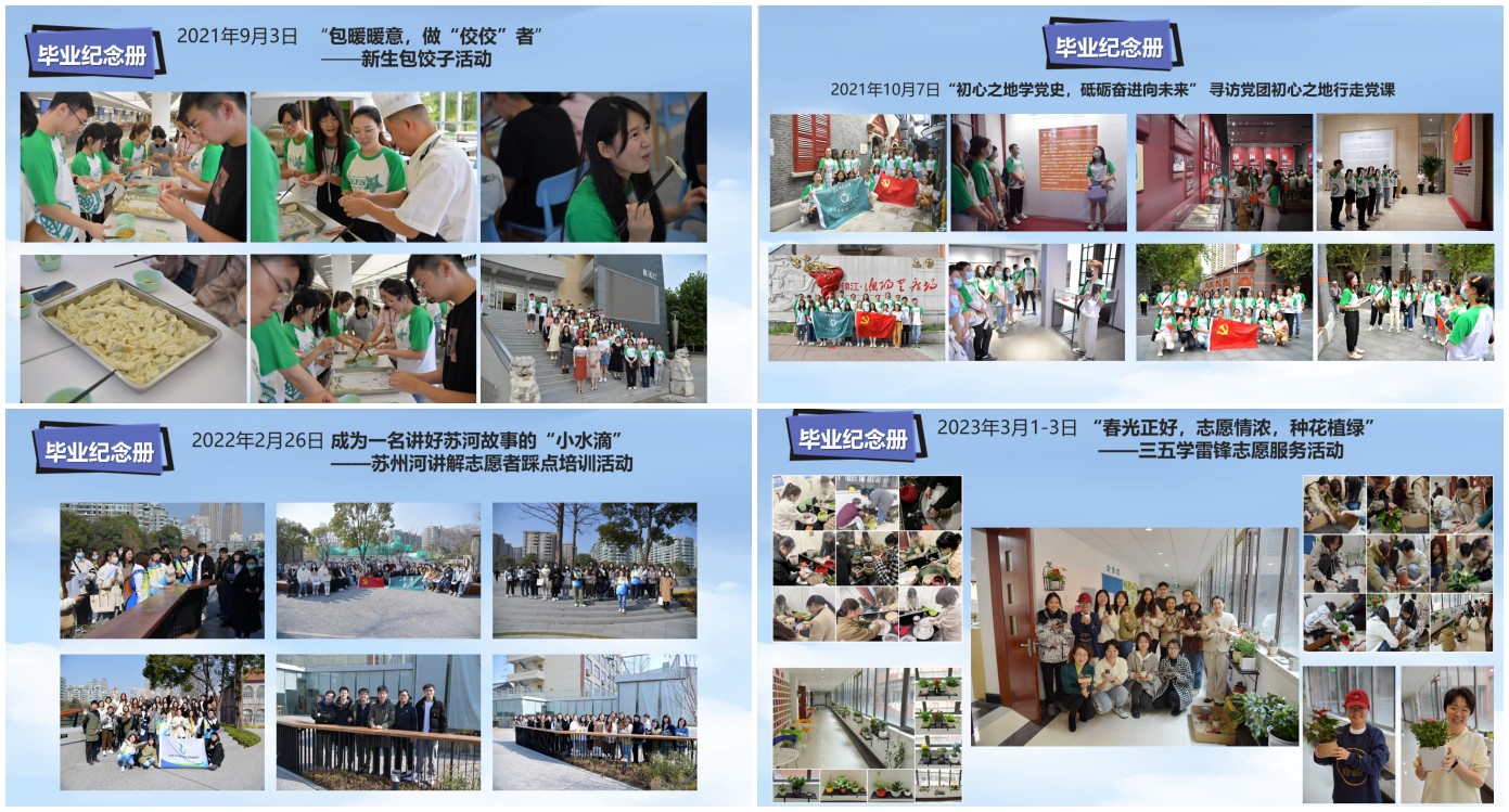随后,当毕业纪念册缓缓翻开,那些熟悉而温馨的画面激起了同学们的共鸣。在路老师的引领下,大家仿佛又回到了那些难忘的时刻:从初入学的懵懂与憧憬,到各种校园活动的大展风采,再到每一个重要节点……每一张鲜活灵动的照片都承载着同学们的记忆和情感。新生入学时一起包饺子做游戏的欢声笑语、苏河边的行走党课、七一表彰大会上的庄严宣誓、“帽”美如花DIY活动中的笑靥如花……这些珍贵的瞬间在记忆之河中闪闪发光。期间,路老师还巧妙地穿插了一些趣味小问题,比如行走党课的路线途经点是哪些地方?大会上诗歌朗诵的题目叫什么?尤其是在校园防疫志愿者身份竞猜环节,大家使尽浑身解数,去猜被大白和小蓝防护服裹得严严实实的伙伴身份,现场气氛热烈非凡,充满了欢声笑语。