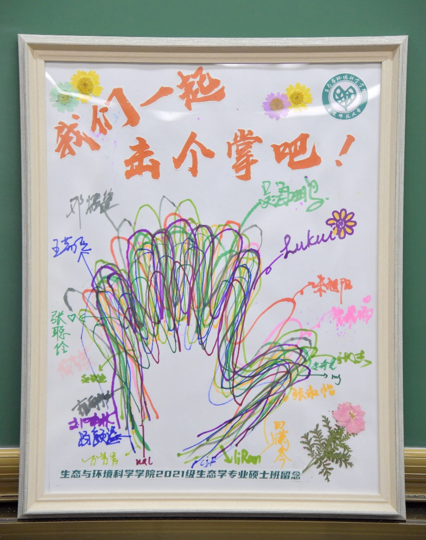 在活动正式开始之前,大家首先进行了一项富有创意的集体“击个掌”活动。同学们纷纷在特制画框内,用五彩画笔细心描绘出自己的手掌形状。当所有人的手掌图案重合在一起时,就像一个个击掌的印记,象征着团结协作和共同携手走过的记忆。这幅充满情感与回忆的画作,将被好好珍藏,作为21级生态硕士班的同学们共度时光的美好见证。