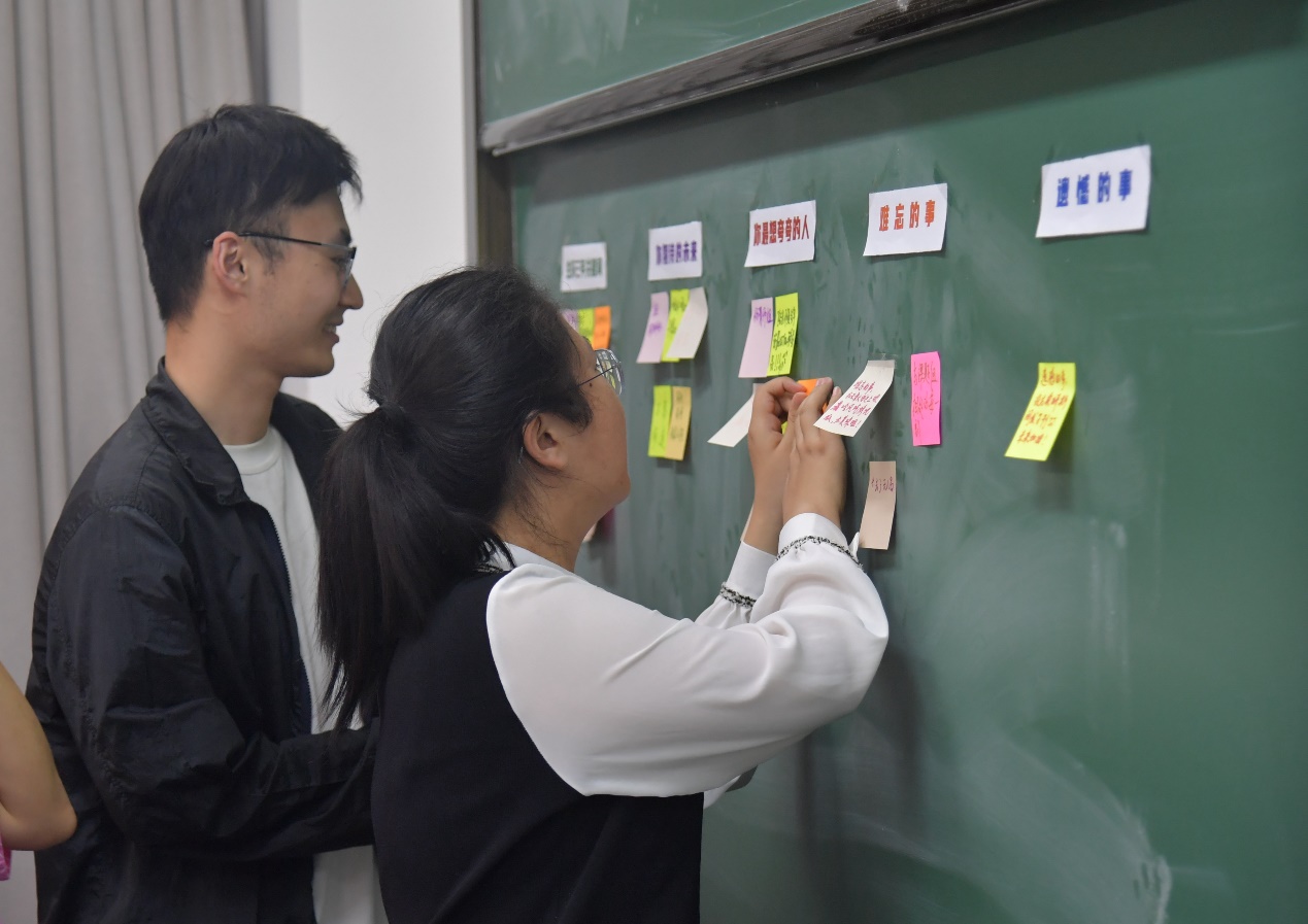 之后,每个人都在便签纸上写下了自己在生环三年的关键词、期待的未来、最想夸夸的人和难忘、遗憾的事。这些文字,或些许感怀,或满怀期待,记录着大家一路以来的成长与变化。杨颜溢同学的关键词里,有驻扎野外长达184天的惊人记录,也有撰写毕业论文期间与同门互帮互助共度难关的温情时刻。吴海鹏同学则化身“夸夸团团长”,幽默风趣地描述了自己与辅导员路老师之间从陌生到熟悉,再到师恩难忘的深厚情谊,他感激路老师的辛勤付出和用心培养,也感谢这些经历让他挖掘出自己的潜能,找到了自己的方向。