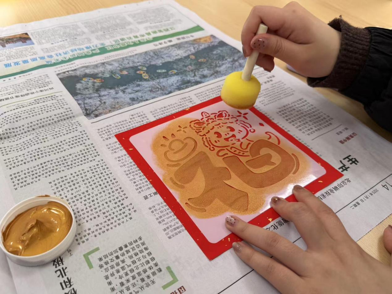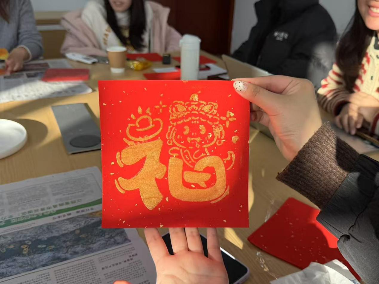 最后,因本次组织生活临近春节,支部特别安排了“福字拓印”DIY环节,为每位党员送上新春祝福。现场拓印模板、金色颜料、印章等材料整齐摆放,节日气氛浓厚。大家纷纷动手,将象征吉祥的“福”字和传统图案拓印在红纸上,金光闪闪的作品让会场洋溢着节日的喜庆与欢乐。