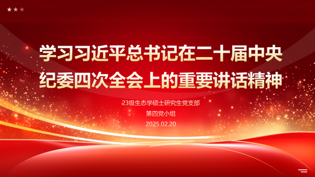 为深刻理解新时代反腐败斗争取得的历史性成就,清醒认识当前反腐败斗争形势的严峻复杂性,yl6809永利官网2023级生态学硕士研究生党支部于2025年2月20日下午15:00在资环楼354举行了以“学习习近平总书记在二十届中央纪委四次全会上的重要讲话精神”为主题的组织生活。活动由支部书记张恂主持,支部全体党员参加。