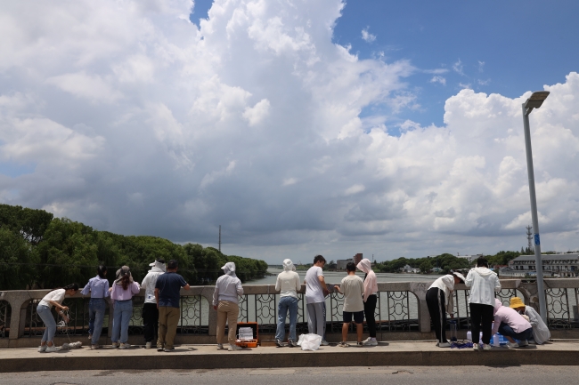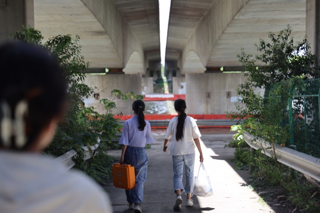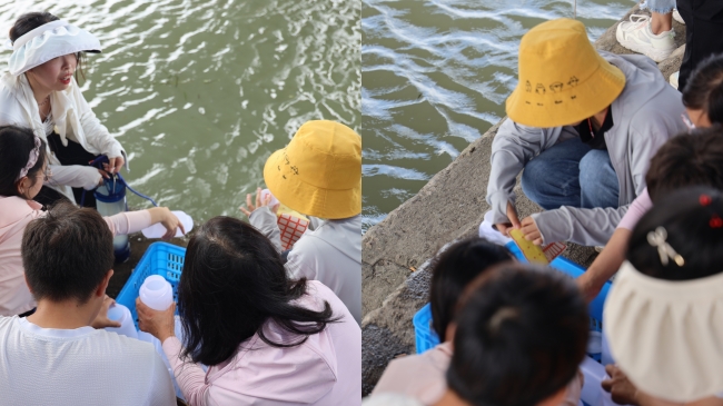 今天我们顶着炎炎烈日在太浦河边采水样、测水质,起初我们的仪器出现了一些问题,测出的溶解氧数据很不合理,反复检查后终于找出了问题根源。随着一次又一次采样及测量的完成,我们逐渐形成了有序的流水线模式,分工越来越明确、操作越来越娴熟、效率也越来越高。下午我们去到了上师大野外观测站,它身处长三角一体化发展示范区,强调要从流域尺度来分析问题,为学生们的科研提供了有力的场所支持。