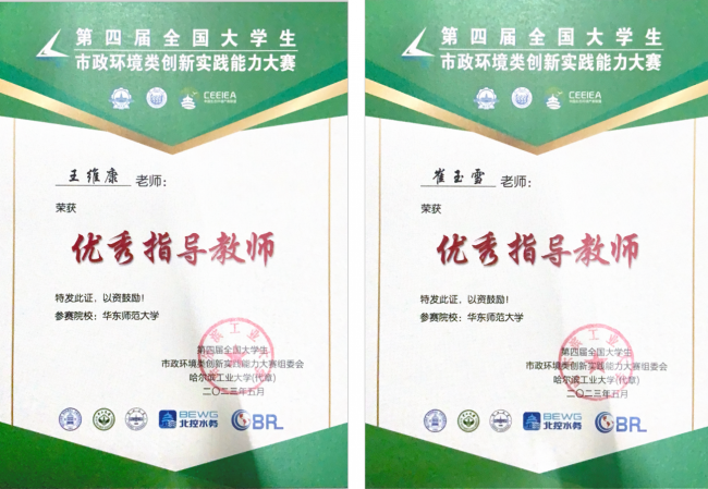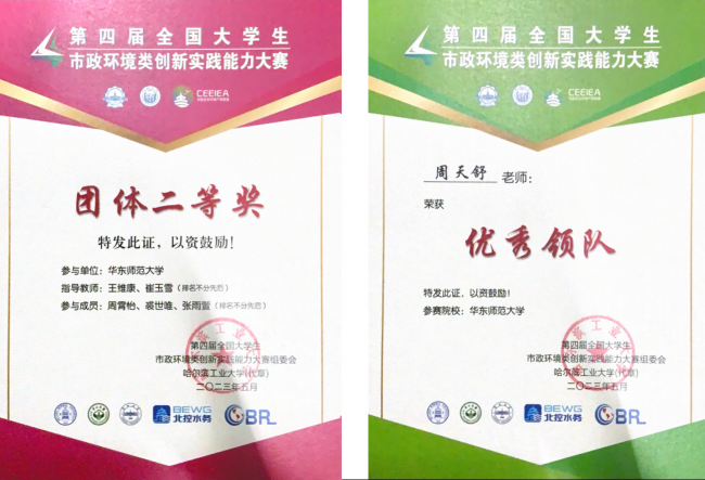 全国大学生市政环境类创新实践能力第三届“北控水务杯”大赛华东师范大学获奖证书
