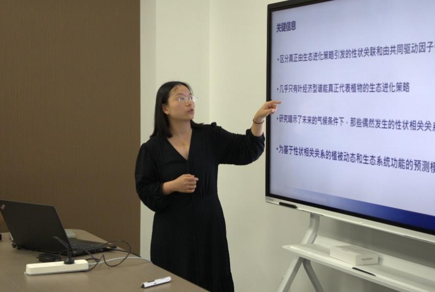 第三位汇报人是来自荷兰莱顿大学的周剑虹同学,她带来了一场特别报告,题目是《性状关联在种间和种内的全球性分析》。该研究探讨了植物功能性状之间的关联性,以及这些关联在不同物种和同一物种内部的差异。研究区分了真正由生态进化策略引发的性状关联和由共同驱动因子引发的性状关联,指出几乎只有叶经济型谱能真正代表植物的生态进化策略。研究还暗示了未来的气候条件下,那些偶然发生的性状相关关系可能不再相关,这为基于性状相关关系的植被动态和生态系统功能的预测模型提供了参考。