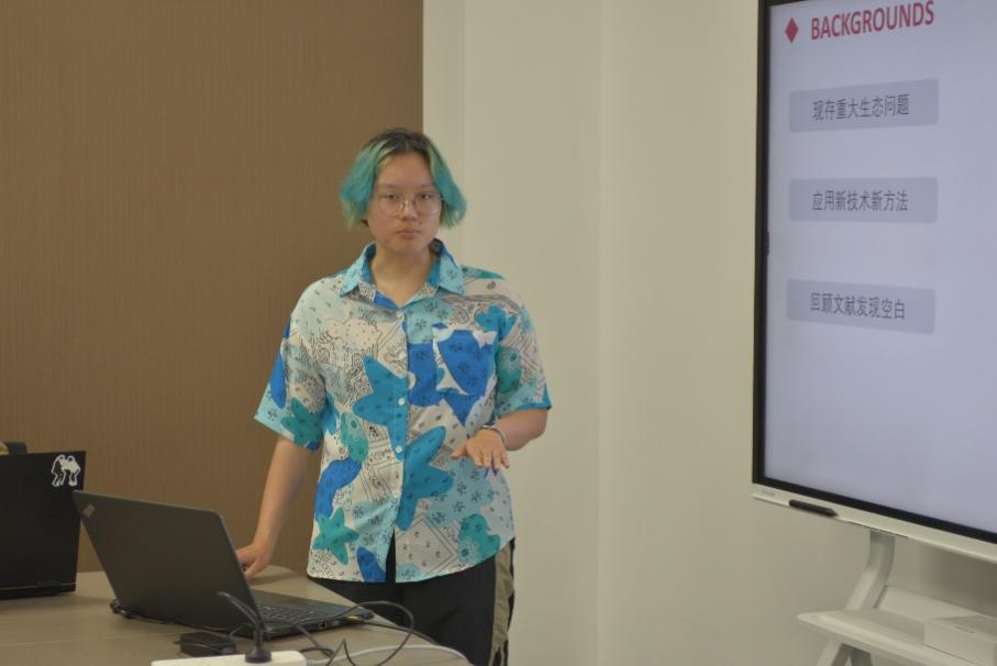 第二位是来自斯幸峰老师课题组的朱颖璨同学,她进展快报的题目是《生物多样性促进生态系统在环境变化的情况下发挥作用》。无论全球变化驱动因素和分类群的类型如何,生物多样性通常对周围环境和操纵环境中的生物量生产具有积极影响。通过阅读这篇文献,可以在千岛湖这种片段化生境中进行其对于生态系统功能的影响的相关探究。