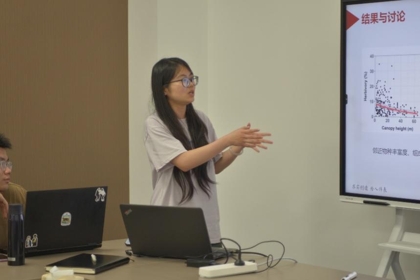 第二位汇报人是来自刘宇老师课题组的黄语卓同学,她进展快报的题目是《热带雨林中决定叶片植食强度的主要因素是树冠高度而不是邻近效应》。这项研究探讨了热带雨林中叶片植食强度的决定因素。研究发现,与邻近效应相比,树冠高度是影响植食强度的主要因素。作者通过对云南省西双版纳热带雨林中215棵树的叶片进行分析,结果显示冠层高度、叶片大小和比叶面积对植食性有显著影响,而邻近物种丰富度、组成和结构异质性对植食性变化无显著影响。研究还发现,植食强度与冠层高度存在负相关。