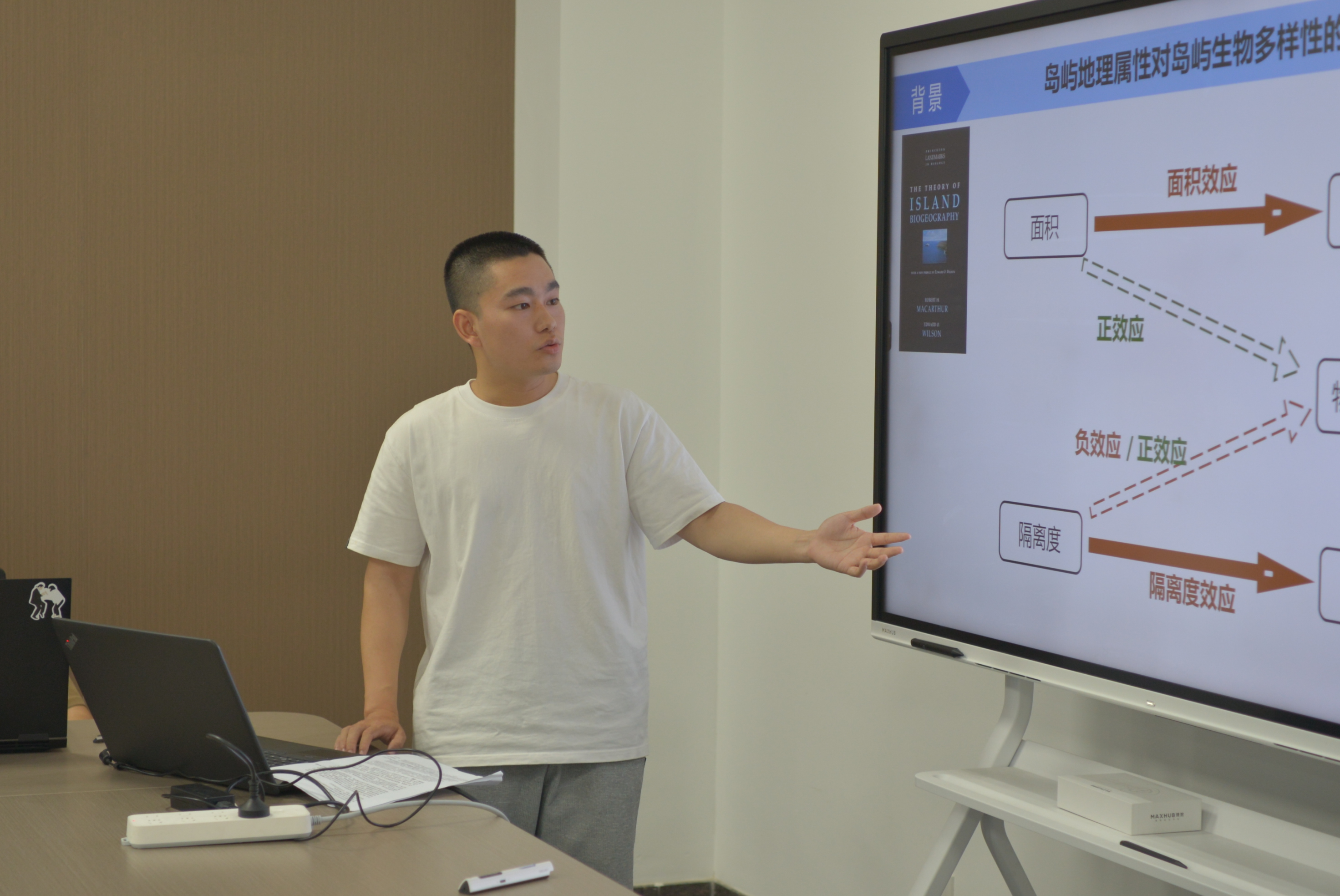 下半场第一位汇报人是来自斯幸峰老师课题组的卢伟同学,他口头报告的题目是《千岛湖鸟类群落的负目标效应研究》。他的研究结果表明,灭绝率随着隔离度的下降而下降,原因可能是负目标效应在起作用。周围大岛对主岛物种的吸引力很大,主岛被作为踏脚石,形成了岛屿上物种的高周转。千岛湖鸟类群落在扩散过程中受到了负目标效应的影响,迁入率随着距最近大岛距离的增加而上升,(局部)灭绝率随着距最近大岛距离的增加而降低。