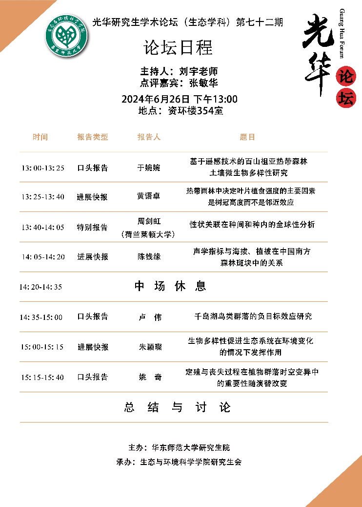 最后一位是来自黎绍鹏老师组里的姚奇同学,他进展报告的题目是《定殖与丧失过程在植物群落时空变异中的重要性随演替改变》。他的研究结果表明,至少在Buell-Small研究系统中,植物群落α多样性动态由物种周转主导,并且其重要性会随着演替进程逐渐提高。该研究系统中,基于出现与否及丰度的植物群落β多样性动态中,物种定殖(个体增补)过程都占主导地位。但是,随演替进程,该过程出现降低趋势,而丧失过程则在后期呈现提高趋势。