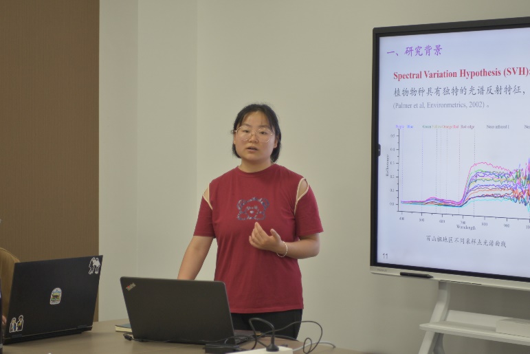 上半场第一位汇报人是来自刘宇老师课题组的于婉婉同学,她口头汇报的题目是《基于遥感技术的百山祖亚热带森林土壤微生物多样性研究》。该研究采用了α多样性分析、地统计分析等方法,结合高光谱数据和LiDAR数据获取森林结构的水平特征、垂直特征等信息。基于遥感技术探究百山祖亚热带森林的土壤微生物多样性情况,探讨了不同采样方案对土壤真菌多样性评估的影响,分别分析了亚热带自然森林和人工森林土壤微生物群落差异及其环境控制因子,并尝试使用数字土壤制图技术进行土壤微生物多样性的空间预测。
