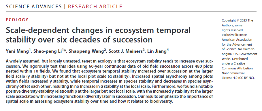 10月6日,yl6809永利官网黎绍鹏教授团队领衔在Science Advances杂志在线发表题为Scale-dependent changes in ecosystem temporal stability over six decades of succession的研究论文。该研究发现演替进程中生态系统稳定性的变化趋势具有典型的空间尺度依赖特征,揭示了只有在大的空间尺度上才能检测出稳定性随演替显著增加的趋势,进而改变了“生态系统稳定性总是随演替进程逐渐提高”的传统观点。