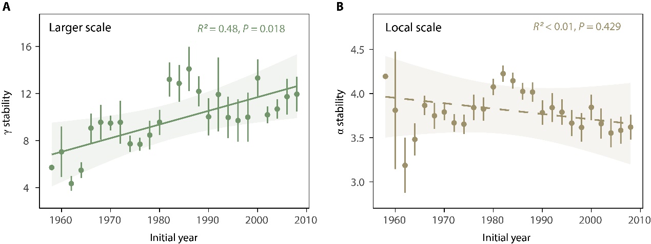 图2. A)在大尺度上,生态系统时间稳定性随着演替显著增加;B)在小尺度上,时间稳定性并未随着演替呈现显著增加的趋势