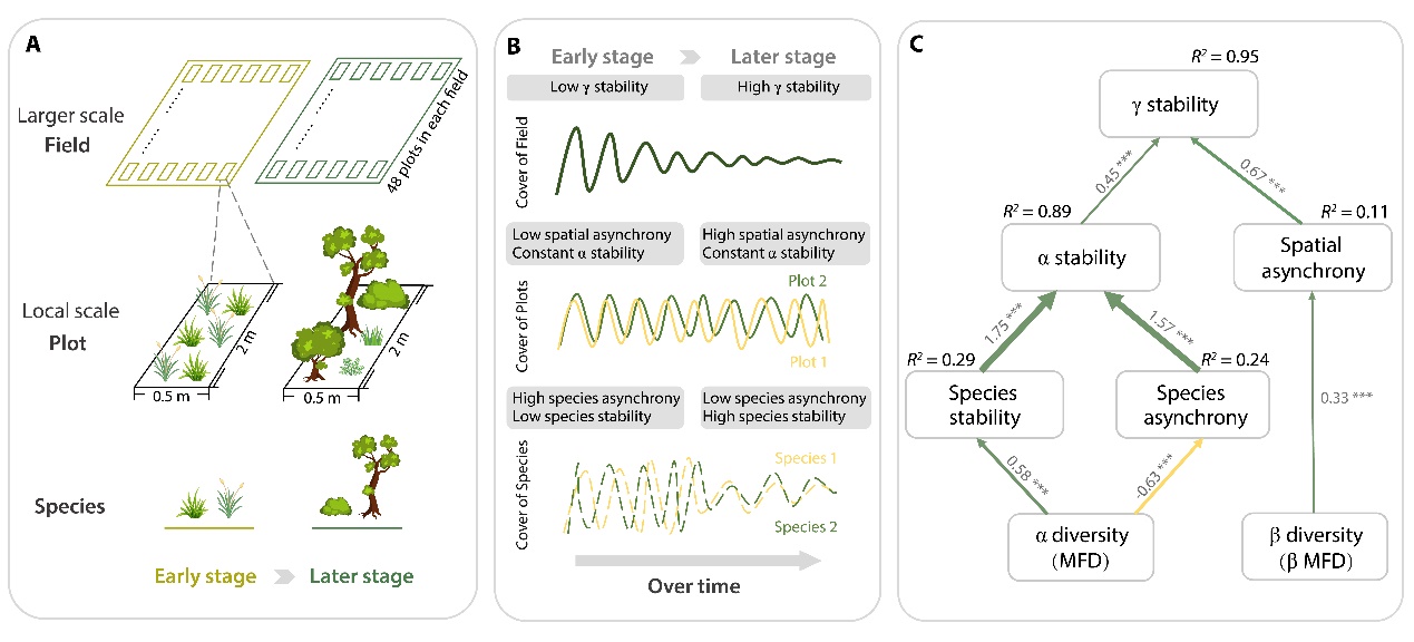 这一研究利用全球历时最长的弃耕地次生演替连续监测序列,基于多尺度稳定性理论框架,解析了60年演替进程中生态系统时间稳定性在样地和样方大小两个空间尺度上的变化趋势。结果表明:在大的空间尺度上,时间稳定性随着演替的深入逐渐升高;而在小的尺度上,时间稳定性并未在演替进程中呈现上升的趋势。在小的尺度上,虽然演替后期物种的稳定性更高,但是不同物种随时间波动的同步性也升高,二者相互抵消,导致小尺度上演替后期生态系统并未趋于稳定。在大尺度上,演替后期生态系统稳定性的提高主要是不同样方的不同步波动所导致的。