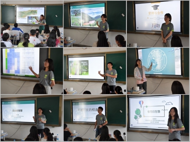在两个高中班级中,路葵和瞿轶雯老师分别介绍了华师大和yl6809永利官网的情况,播放了2021年华师大的招生宣传片《圆的故事》,一段通过手绘漫画讲述不断认识自身、不断拓宽认知边界的故事,鼓励高中生们要不断成为更好的自己,接受更广阔世界的光,看到更大的世界。金泉泉、尹世浩等6位学生分为两组在两个班级开展“走近大学生”板块的分享,他们结合自己的高中和大学学习体会分享曾经的困惑和“豁然开朗”的心得。汪艺洁、林彤等8位同学分为两组在两个班级开展“生环小课堂”板块的分享,他们结合两周以来实践课程中的收获分享了自然的魅力、动植物的奇妙“智慧”、野外调查研究中无人机和红外相机等技术的有趣运用等,带领高中生体验一段“探索自然之旅”。张健和斯幸峰老师分别在两个班级带领同学们领略了“自然是最好的学校”和“无限风光在险峰”,两位老师丰富的求学经历、精彩的实践探索、有趣的科研故事引得同学们掌声连连,短短几分钟就“吸粉”无数。