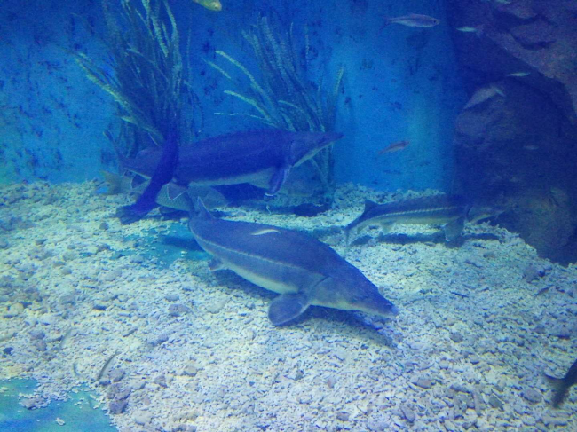 序厅展示的是有关河口方面的基础知识,有介绍长江水系流域的大型沙盘,还有国内最大的表现河口地区四季景色变化的超大弧形影像墙。仿真游艇可以让同学们体会大江大河的实景。期间,张老师和一位小同学为大家讲述了中华鲟的故事。