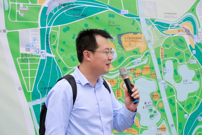 下午三点自由参观结束后,同学们共同前往辰山。辰山属于佘山山系,海拔约70米 。明代董其昌记载,辰山“在诸山之东南,次于辰位”,也以此得名。20世纪由于采石,山的南坡已被削去。在植物园的设计中,这一部分被改造成为矿坑花园。矿坑花园的原址为一处采石场遗址,设计者通过生态修复,并对深潭、坑体、迹地及山崖进行适当的改造,使其成为一座风景秀美的花园。参观过程中,柳林老师从地质环境灾害的角度出发,为同学们详细讲解了矿坑可能发生的地质环境灾害及可采取的防范措施和手段。