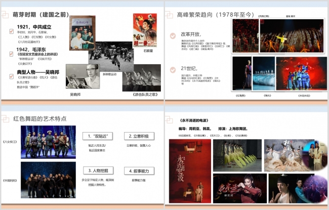在《我所了解的红色舞蹈》分享的第一部分,董舒老师为大家梳理了红色舞蹈的发展脉络,从新中国成立前的萌芽时期,到改革开放前的蓬勃发展时期,到改革开放后的高峰繁荣时期,介绍了不同时期的代表作品和代表性人物。在第二部分,董舒老师结合舞剧《八女投江》和《中国妈妈》介绍了红色舞蹈选材注重“双贴近”、立意积极进取昂扬向上、深刻挖掘人物特性、出色的叙事能力的四个艺术特点。在第三部分,董舒老师结合优秀红色舞剧《永不消逝的电波》,详细介绍了舞剧在舞蹈动态方面从人物出发开掘动作,通过不同人物的肢体表达增强艺术形象的可信度和艺术感染力;在创作手法上大胆创新,将科技元素融入舞美,改变舞台叙事节奏,呈现多种叙事的空间。董舒老师的分享带领大家以“红色舞蹈”为基点回顾了中国共产党的百年历程。