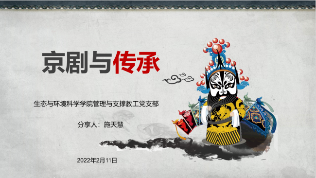 2022年2月11日下午,yl6809永利官网管理与支撑教工党支部举办第二场寒假学习分享主题活动,分享人是欧阳澳、丁媛媛、束亚男、杨庆松老师和施天慧同学。欧阳澳老师分享的主题是《新加坡都市农业带来的启示——从电影<我们的故事>谈起》、丁媛媛老师分享的主题是《只此青绿舞绘就千里江山图——走近中国传统文化》、束亚男老师分享的主题是《坚定四个自信,砥砺奋进——<厉害了,我的国>观后感》、杨庆松老师分享的主题是《北京冬奥会中的文化、科技和中国青年》、施天慧同学分享的主题是《京剧与传承》。