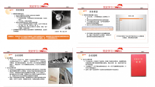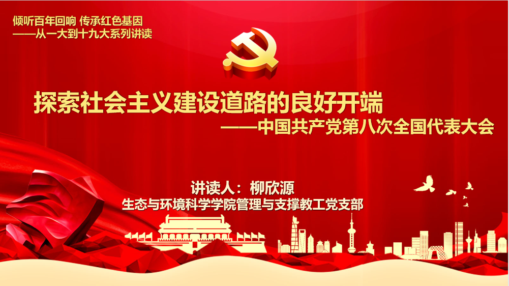 第八讲由管理与支撑教工党支部党员柳欣源讲读“探索社会主义建设道路的良好开端——中国共产党第八次全国代表大会”。中共八大是中国共产党在全国范围内执政后召开的第一次全国代表大会。柳欣源老师详细介绍了七大以来,当时国际形势和国内形势分发生的翻天覆地的变化。人们都意识到,科技成果转化的生产力对促进经济发展和保障国家安全的巨大作用。在国内,自1952年提出过渡时期总路线后,我国无产阶级和资产阶级的矛盾已经基本解决,社会主义基本经济制度在我国建立起来,这为八大做出国内主要矛盾变化的重要判断,从而为实现党的工作重心的转变提供了令人信服的基本依据。1956年,中国共产党已经开始对社会主义道路进行探索并取得了初步成果。在此背景下,1956年9月15日至27日,党的八大在北京全国政协礼堂举行。会议到会代表1021人,请假5人,列席代表107人。毛泽东致开幕词,刘少奇作政治报告,邓小平作《关于修改党的章程的报告》,周恩来作《关于发展国民经济第二个五年计划的建议的报告》。大会对社会主义改造基本完成以后国内的主要矛盾作出了科学判断;提出坚持既反保守又反冒进,在综合平衡中稳步前进的经济建设方针,积极探索改进经济管理的方针政策,扩大人民民主,建立健全社会主义法制,明确社会主义思想文化建设的方针任务,坚持以和平共处五项原则为基础的外交政策;提出了执政党建设的问题,强调要坚持民主集中制和集体领导制度,反对个人崇拜,发展党内民主,加强党和群众的联系。大会通过了《中国共产党章程》、《关于政治报告的决议》和《关于发展国民经济第二个五年计划的建议》。选举了由97名委员和73名候补委员组成的中央委员会。