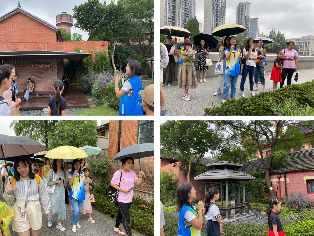 活动开始,即使小雨蒙蒙也阻挡不了小朋友们与家长的热情。进入步道后,先由陈举艳讲解员为大家介绍苏州河的水文和历史背景。被苏州河“∩形环抱”的华东政法大学长宁校区,正是圣约翰大学原址所在。这所曾经的世界名校有“东方哈佛”的美誉,校园中保留的历史建筑不少都跨越了3个世纪。清水砖墙、飞檐翘角、大理石弹格路,漫步其中仿佛一步梦回百年前,每一步都是与岁月同行。一路上,陈举艳讲解员带领大家游览古朴典雅的百年建筑,看西式外廊与传统中式屋顶风格叠加,屋脊飞檐翘角一展建筑艺术的魅力。还有一步一景的迷你中式园林,小窗疏影的雅致,绿地石径的巧妙,将这里打造成曲水流觞的动态山水画。