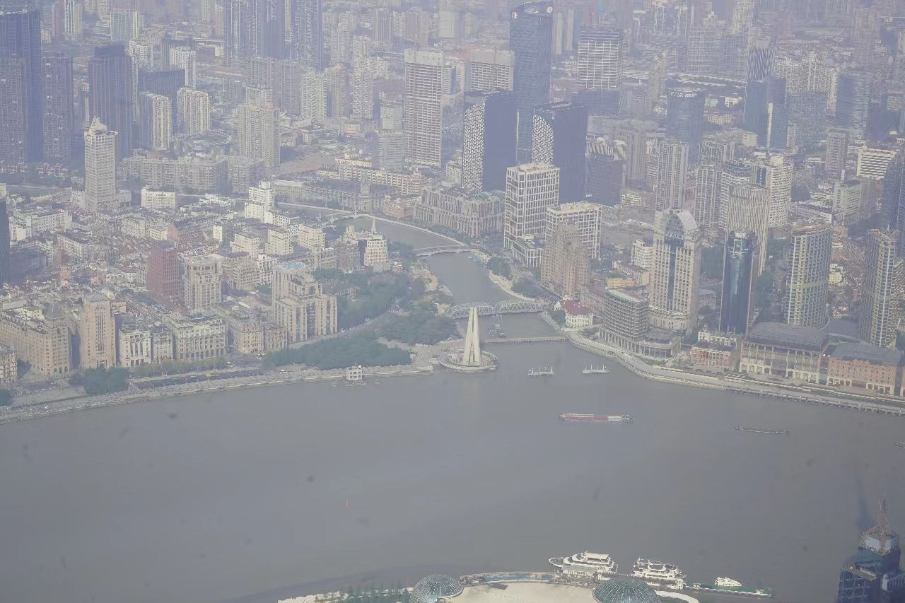 “位于我们正下方的是上海房价最高的小区——汤臣一品,一个城市最好的居住环境还是在江边。”接着映入眼帘的便是南浦大桥,再下游就是卢浦大桥。在两桥之间便是同学们耳熟能详的上海世博会标志,其中一个白色鸡蛋形的场馆便是——梅赛德斯奔驰中心,许多的演唱会便在此举行。在梅奔中心的对面是发电区的老厂房,如今改造成了上海艺术馆。在以往天气好的时候可以看到闵行校区附近的两个大烟囱,这便是上海吴泾第二发电有限责任公司的冷却塔了,该厂是上海地区投资总额最多、环保水平最高的电厂之一。